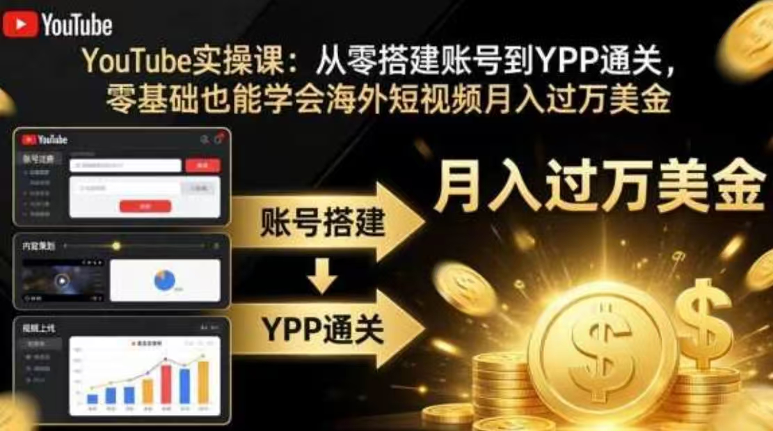 本课程是YouTube实操课,聚焦YPP变现与月入过万目标,全程以落地实操为主。课程共九大章节,从平台认知、账号环境搭建、安全IP与环境隔离讲起,系统覆盖爆款选题脚本、视频剪辑制作、Shorts短视频冷启动、SEO精准引流、YPP开通通关、多元变现拓展及账号合规维护,形成从0到1起号、涨粉、变现、长期稳定盈利的完整闭环,零基础也能直接照搬操作。